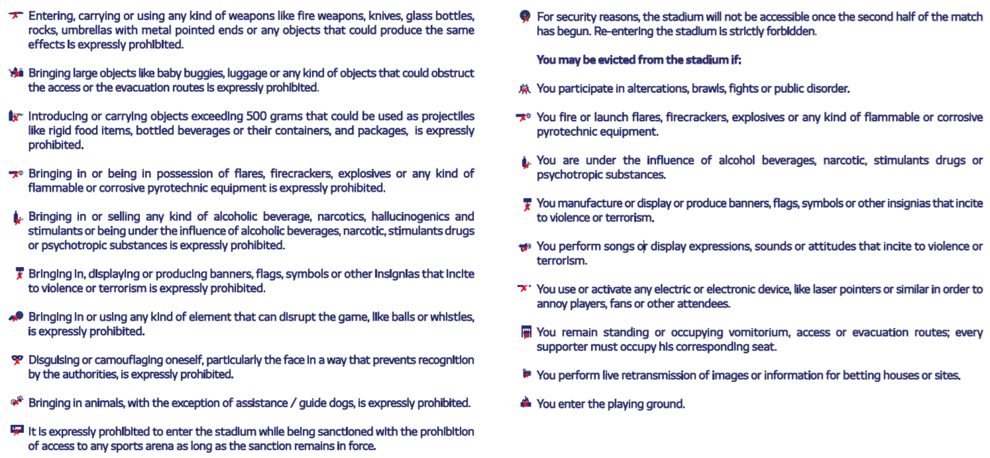 Only supporters with a valid match ticket will be admitted. Damaged or forged tickets, or people who have lost their ticket will not be allowed access. Entry into the stadium can be slow so please arrive in plenty of time. There will be ticket checks and searches at the entrance to the turnstiles.