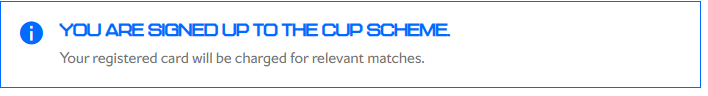 Click on Show Cup Matches and you will then be prompted with a confirmation page confirming you are registered for the cup scheme.