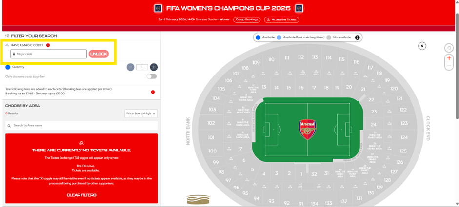 The magic code will give you direct access to seats during the pre-sale, this code will be sent via email to our Arsenal members.