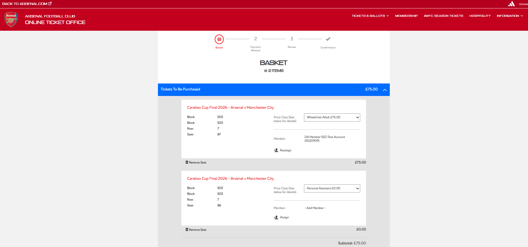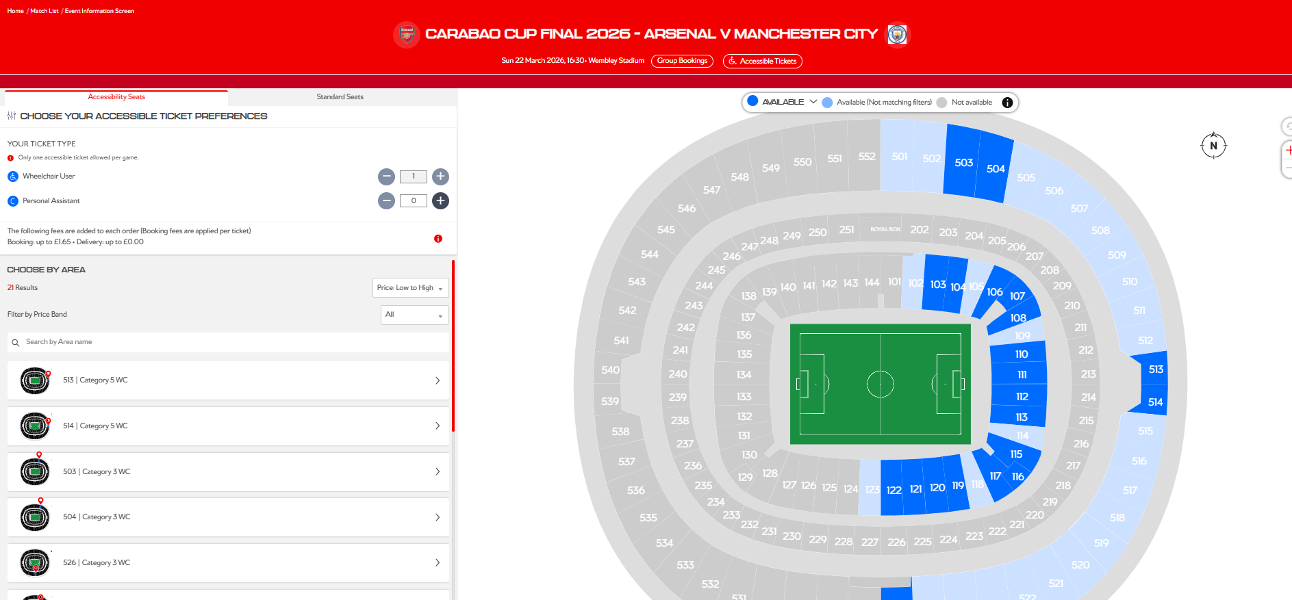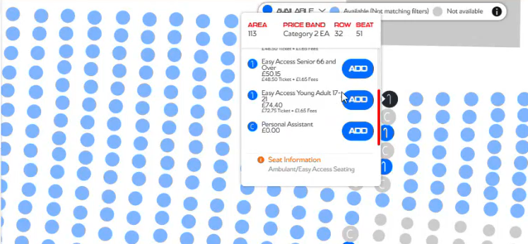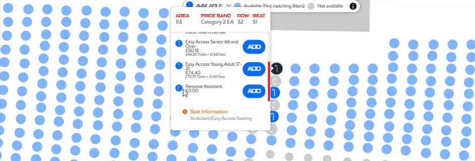 Once you have selected your own seat, please add the accompanying seat to your basket for your Personal Assistant.