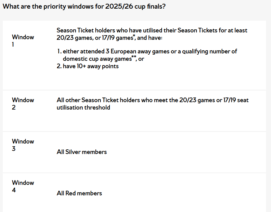 The new criteria will give higher priority to season ticket holders and members who have travelled to see the team play in the relevant competition, both home and away. Our Season Ticket holder numbers far outweigh the limited allocations we receive for cup finals.